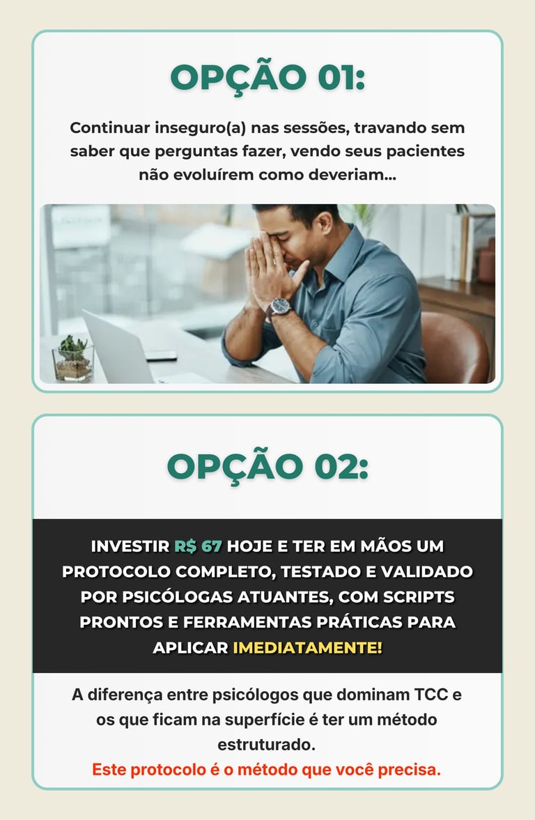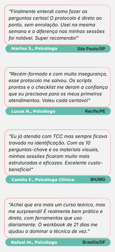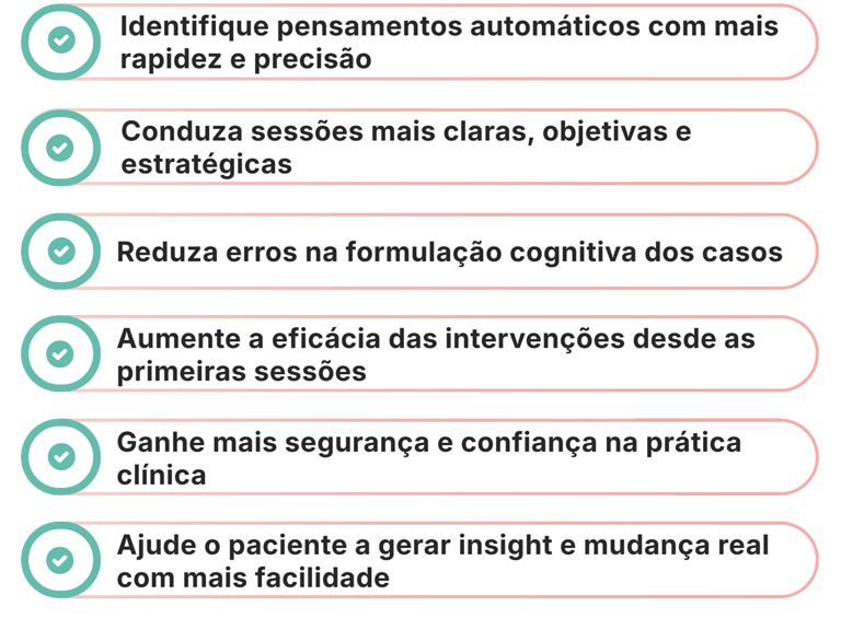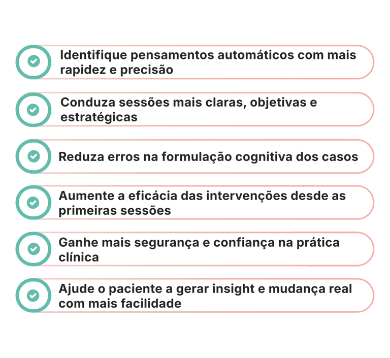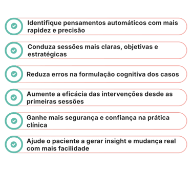 Um protocolo estruturado para identificar pensamentos automáticos, padrões cognitivos e direcionar intervenções com mais segurança desde as primeiras sessões.